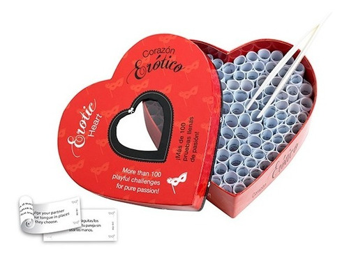 ¡Más de 100 pruebas llenas de pasión! Un juego que estimulará tus sentidos y los de tu pareja.- Caja de cartón duro en forma de corazón que contiene 100 pruebas y unas pinzas.- Reglas del juego: Uno de los dos elije un rollito del corazón con unas pinzas. ¿Qué va a suceder? Disfrutarán juntos de un juego de seducción, de un preludio amoroso, de una fantasía compartida o de una prueba erótica- Ejemplo: “Tapa los ojos de tu pareja y dale un masaje sensual en el rostro”- Idiomas: castellano e inglés (uno a cada lado del papelito)